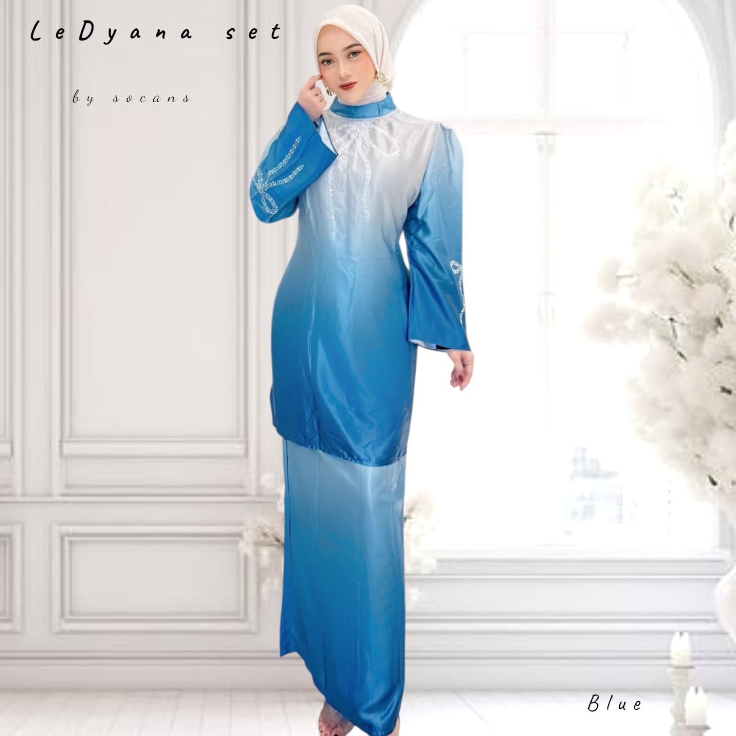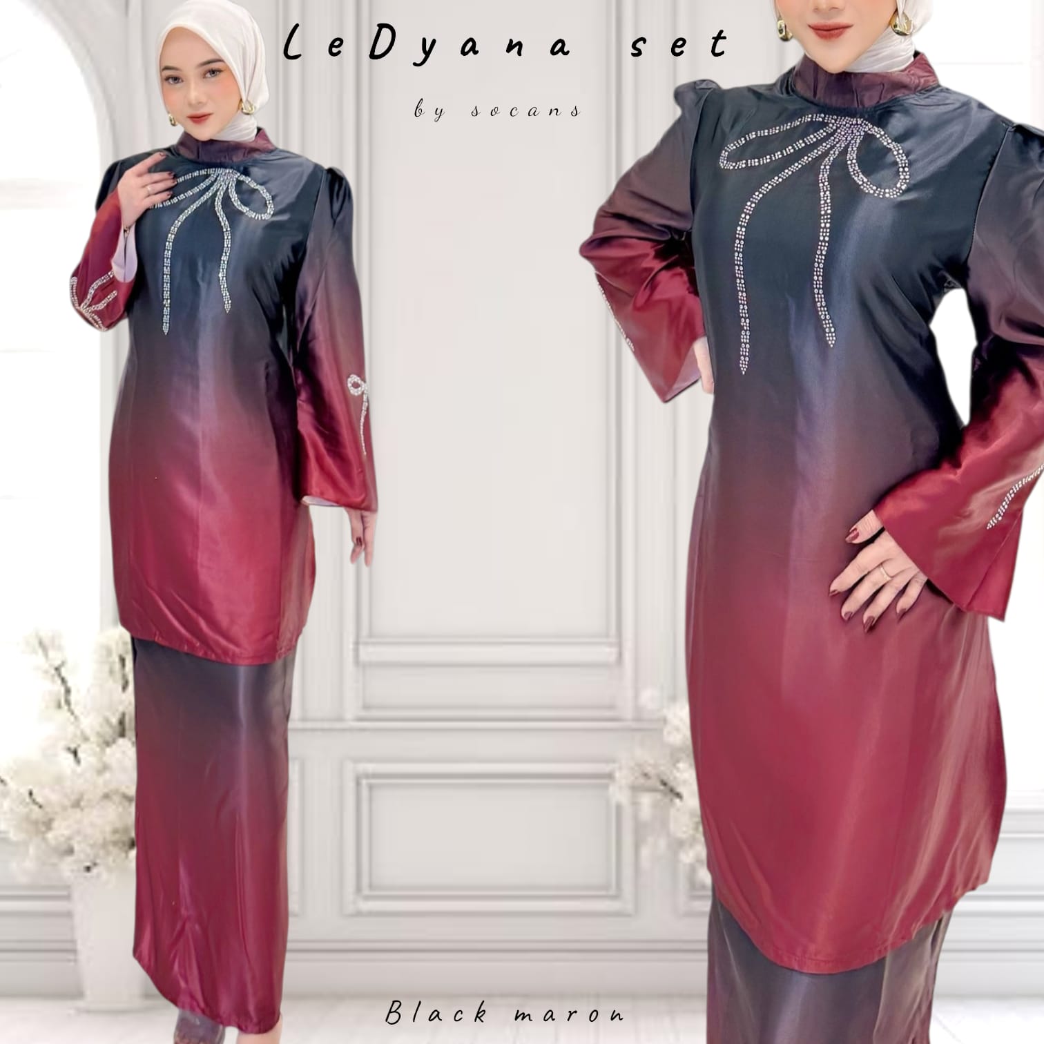 - Hiasan crystal mote yang membentuk pola pita, menghiasi bagian badan dan lengan, menambah kesan berkilau dan eksklusif.