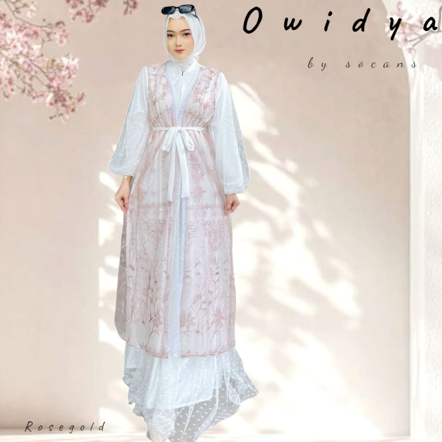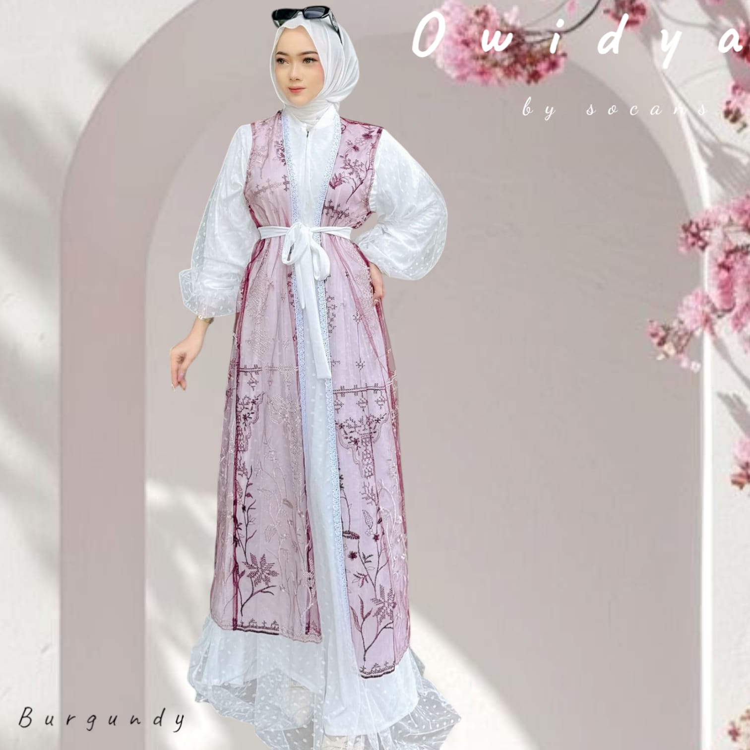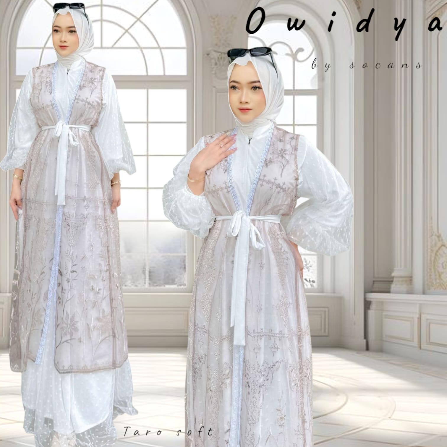 Kombinasi outer dan gamis modern dengan detail mewah.