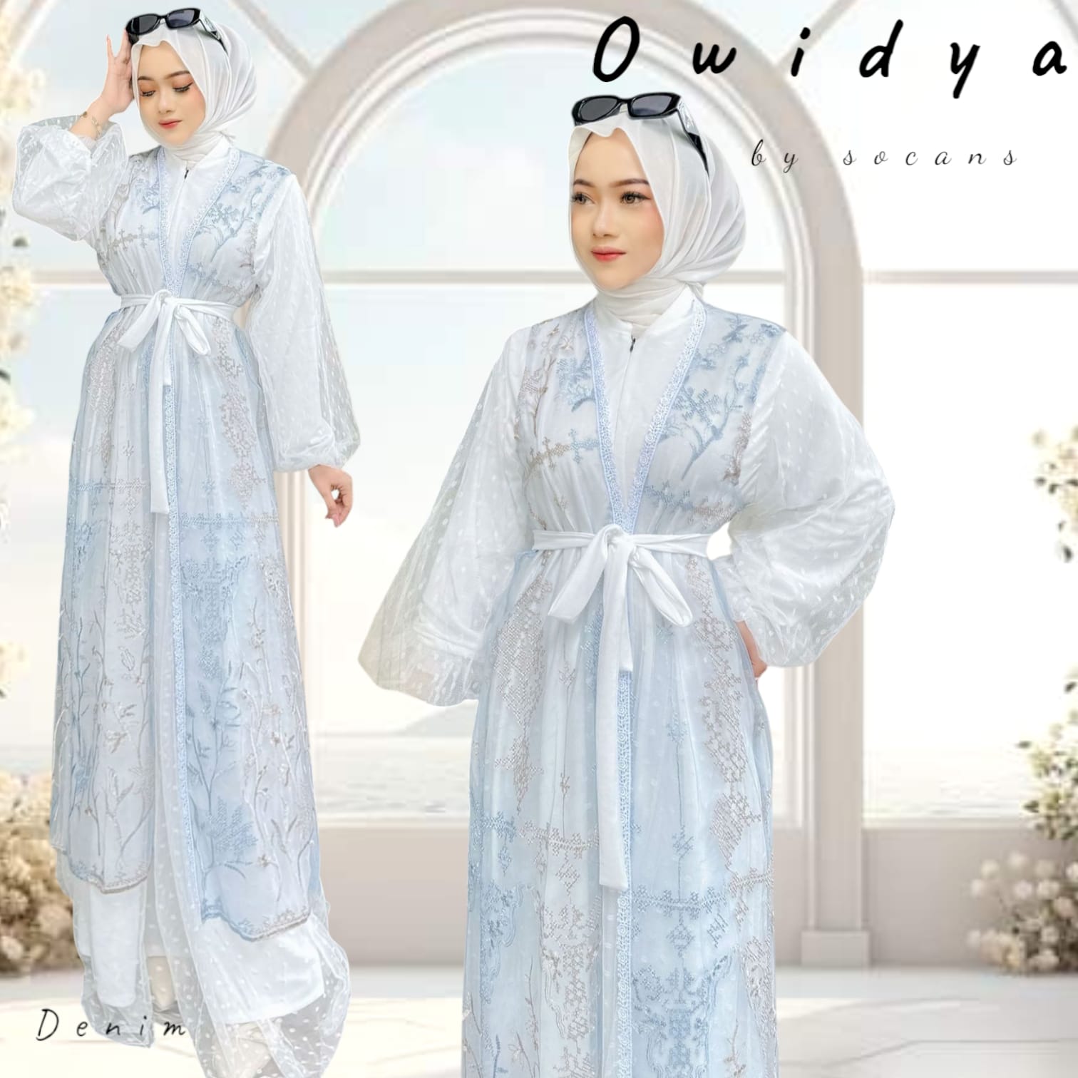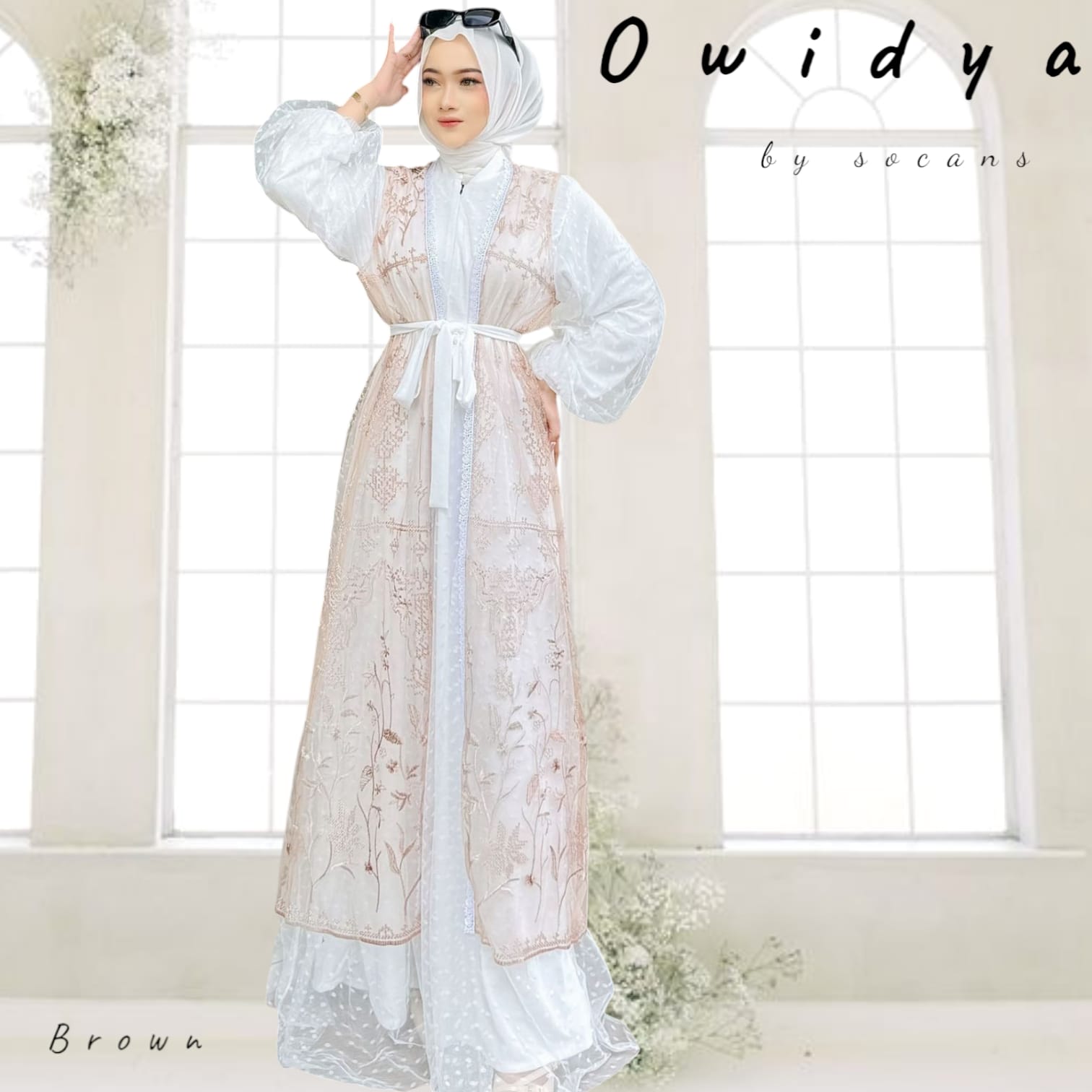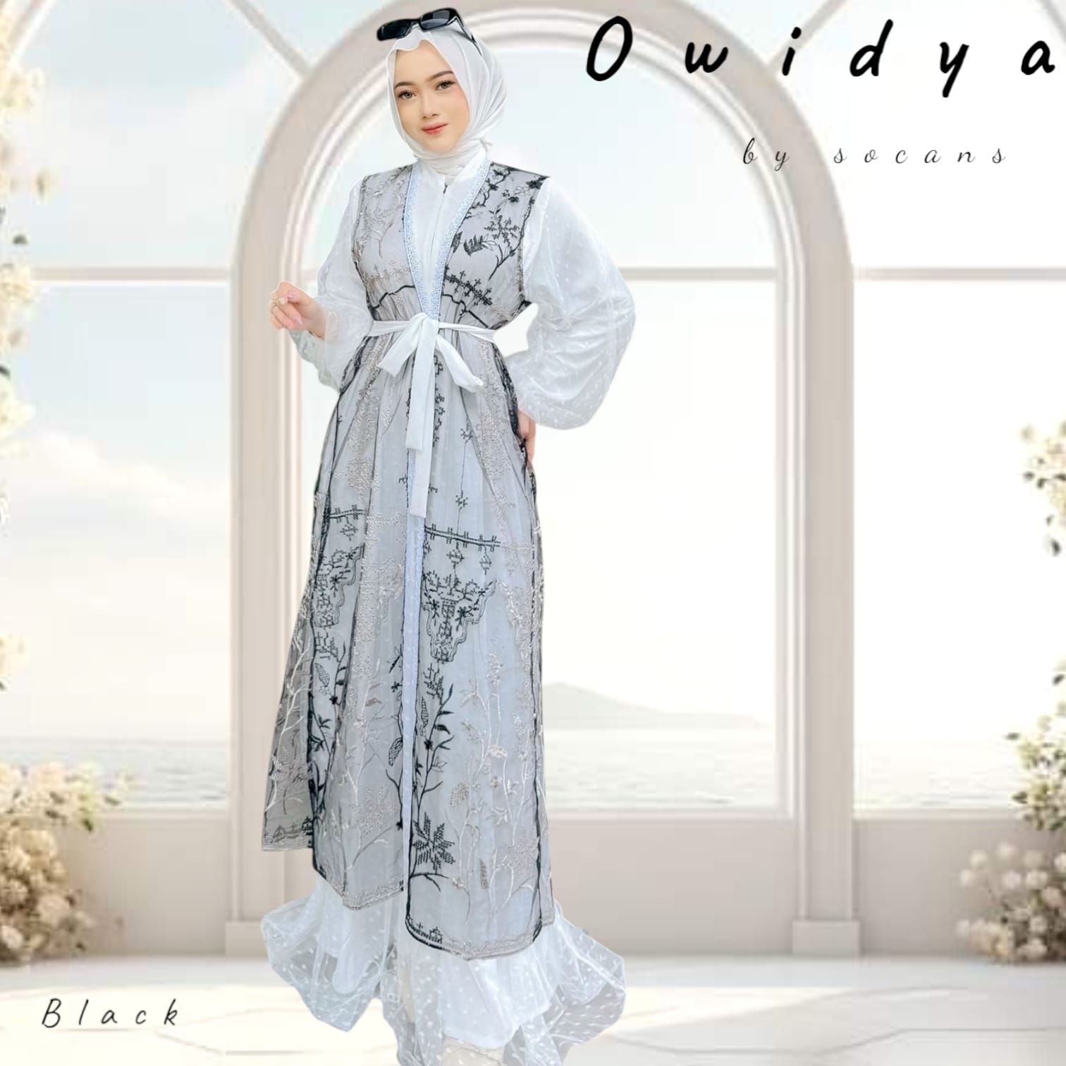 Kombinasi outer dan gamis modern dengan detail mewah.